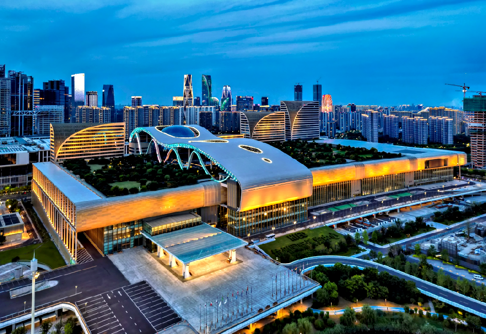 北京首钢会展中心有十四个展馆,新首钢高端产业综合服务区(简称首钢园区)位于长安街西延长线与永定河绿色生态走廊交汇处,占地面积8.63平方公里,在地理区位、空间资源、历史文化、生态环境上具有独特优势,在新版北京城市总体规划中,新首钢地区未来将成为传统工业绿色转型升级示范区、京西高端产业创新高地、后工业文化体育创意基地。